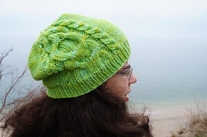 Just enough to keep you occupied. This simple semi slouch hat features a cabled panel on reverse stockinette.