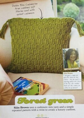 This is a pattern for Tassels Cushion Cover, originally published in Simply Knitting. It has a stocking stitch back and a twisted stitch pattern on the front, moss stitch edges and tassels. Photos Simply Knitting.