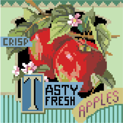 Designed by: Nancy Rossi\nJuicy and sweet, Tasty Fresh Apples is one of four traditional crate-label style fruit motifs to add a bright splash of color to any room décor. Collect all four: Sweet Oranges, Choice Fancy Pears, Tasty Fresh Apples and Fancy Lemons. This set is designed by Nancy Rossi and are beautifully adapted by Sara Angle. These stitch up to 6” x 6” square on 14 count Aida.