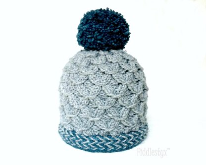 This thick textured hat will keep you warm and cozy. It features a Latvian braid as a brim and a fun pom pom on top. Knit it in two high-contrast shades for a pop of color or two similar ones for a more subtle look.