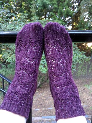 A little texture and a little lace. With textured purl stitches that undulates above lacy diamonds. All of the stitches are basic, making this a good pattern for those with some sock knitting experience wanting to dip their toe in ( pun intended) the lace knitting waters as well as those that have already dipped. I would also recommend this to the advanced beginner who has made a pair or two of socks. Any fingering/sock weight yarn that gives you the appropriate gauge can be used. A variety of yarns were used for the test knitting with wonderful results.