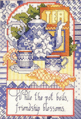Designed by: Barbara Baatz Hillman “While the pot boils, Friendship Blossoms” Tea for Two and Two for Tea, a warm friendship for You and Me. This delightful small design would look lovely in a sunny kitchen. Stitch it onto a larger piece of linen for a one-of-a-kind towel hostess gift.\n