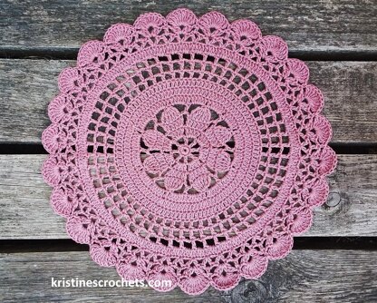 The doily you can make by following this pattern will be approximately 34cm (13.4 inches) in diameter.