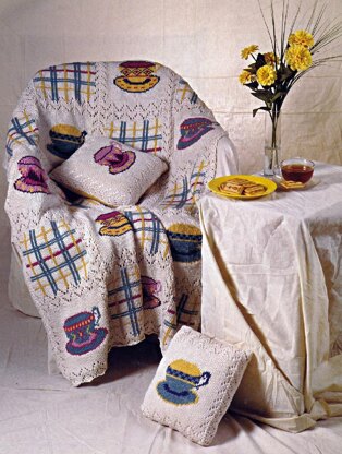 You will want to use this pretty afghan and pillow combo all the time, not just at tea time. The Tea Time Lace afghan and pillow are made using a lace and solid, stockinette stitch background with duplicate stitch motifs. The afghan is knit in one piece, and, then the teacups and plaid are added with duplicate stitch.