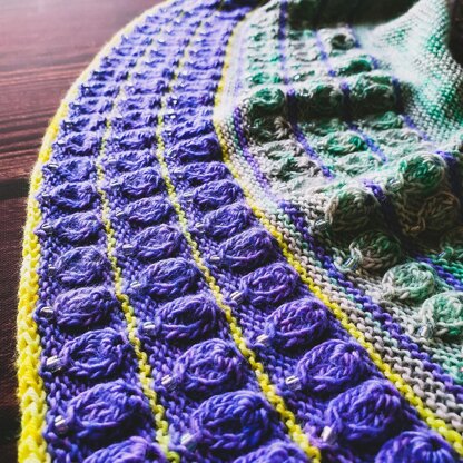 This asymmetric triangular shawl is worked flat with five different colors and a lot of blingbling-beads. If you don’t like any beads, you can ignore them completely. No problem.