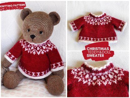 Pretty Christmas Teddy Bear & Doll Sweater – knitting pattern for Doll Norwegian-style Lopapeysa sweater.