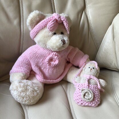 Teddy in a pink smock with a headband and small teddy in a handbag which she loves taking with her on outings. The small teddy in the bear hug pattern which I have included fits in the knitted bag perfectly . There is a flower knitted pattern with the bear hug pattern which can be sewn onto the smock and bag.I love using paintbox yarns for my projects