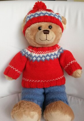 A three piece out fit for bears - ideal for build a bears - knit in double knit yarn. Separate instructions are given for knitting on straight needles worked in rows, and for dpns, working in the round. The sweater also has a wide neck band that fits over the bears head without the need for fasteners