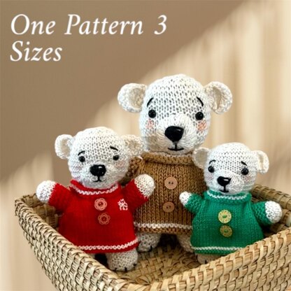 The Large Teddy when knit with 5mm needles is 22 cms tall, the Medium Teddy when knit with 4mm needles is 18cms and the Small Teddy when knit with 3mm needles is 15cms.