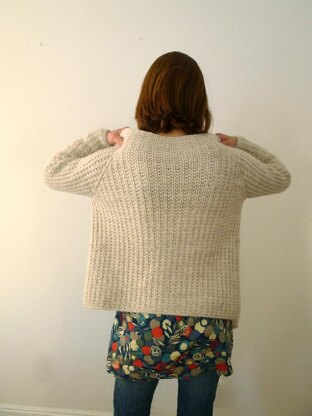 Teddywidder is an open blanket cardigan knit up in a cozy wool/alpaca blend. It is seamless, with raglan sleeves and a top-down construction.