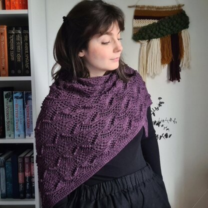 Techniques used : Asymmetrical triangle shawl worked sideways I-cord cast-on, borders and bind-off Garter stitch Knit Front Back Increases Lace with eyelets, simple decreases, twisted stitches Bobbles and mock eyelet cables (video tutorial provided) Pattern includes charts and written instructions