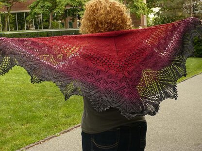 A top-down triangular shawl, with an architectural lace pattern that emerges smoothly from a solid stockinette foundation. Geometric diamonds and angles give way to smooth arches on the bottom edge, accentuated by the little peaks of the picot BO.