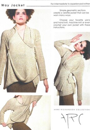 This jacket is created from two simple geometric shapes and two sleeve sections that you will knit, by hand or machine or possibly even crochet, using your own choice of yarn. The jacket shown, is made on a Knitking Compuknit Bulky machine, using a coned flat ribbon rayon yarn. PLEASE NOTE THAT I HAVE SUGGESTED ROWAN TWEED YARN, but the concept here, is for you to create variations of this jacket, using your own choice of yarn or yarns, as part of the sweater can have a different complimentary yarn. Once you have established a suitable gauge for the yarn or yarns chosen, you will calculate your own number of stitches and rows, using a little simple math, on the blank page provided. The pattern has detailed written instructions and schematics to help you through this process. Please understand though, due to the nature of this design, that it is impossible to give an accurate stitch and row or yardage amounts.