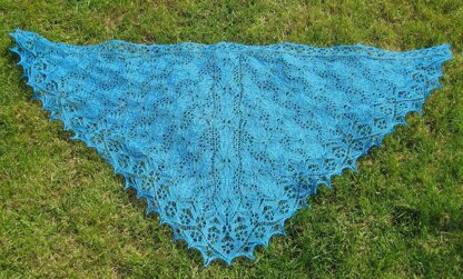 Шаль вяжется сверху вниз, имеет треугольную форму, центральный фрагмент и околошейную кайму. Вяжется одним полотном.