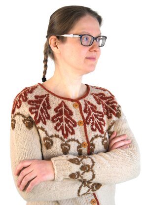Short rows placed at the bottom of the yoke help to create a well-fitting, round neckline. The body of the garment can be knit with or without waist shaping; instructions for both variations are provided. Two rows of acorns decorate the cuffs of the full-length sleeves which are then finished with ribbing. Ribbed button bands embellished with a contrast-colored i-cord edging are worked last.