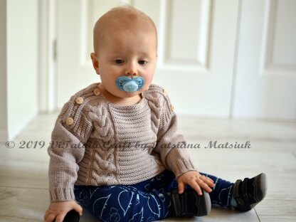 Knitting pattern for Terra Sweater is written for sizes from baby through child 5-6 years. It is easy to follow and contains written pattern, both charts and row-by-row instruction for cables as well as a photo tutorial for sweater assembly.