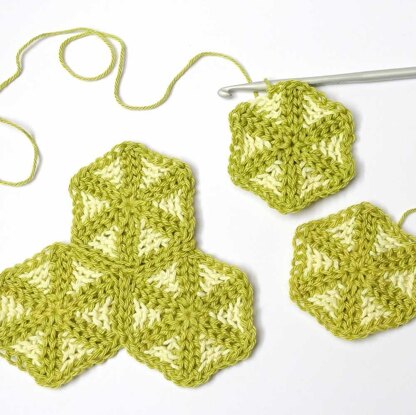 Tessa’s Triangles hexagon pattern is an introductory pattern. Learning how to work the stitches this way is the key to more advanced patterns. Another pattern is coming up soon. You might also get ideas for making some on your own after making the hexagon.