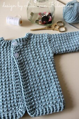 This gorgeous, textured baby cardigan is perfect for boy or girl. Includes sizes 0-3 mos up to 12-18 mos. The cardigan is made to measure according to a standard size chart provided in the pattern.