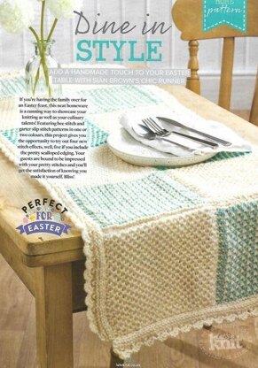 This is a pattern for a textured table runner, originally published in Lets Knit. It is made up of separate squares, in bee stitch and garter slip stitch, with a shell edge. Photos Lets Knit.