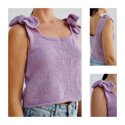 With a clean, minimalist design, this pattern is perfect for beginners. It’s worked in stockinette stitch with subtle garter stitch details, making it easy to follow while still offering an enjoyable knitting experience. The top is constructed in two flat pieces with side seams, and the straps are seamlessly integrated into both the front and back, ending in a gentle pointed shape that falls softly over the shoulders for an adjustable tie.