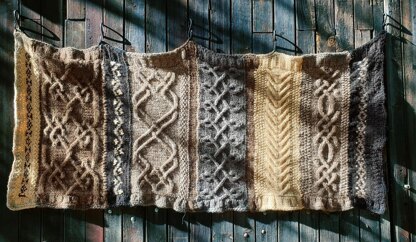 This cable sampler wrap is a great opportunity to either go stash busting on your favorite yarn, or use scraps that are left from other projects - or even try new yarns and using these charted sections as swatches for testing the new yarn. The wrap is knitted in several sections which are then seamed together, or in some cases, you are picking up stitches and continuing the wrap seamlessly with a perpendicular new design.