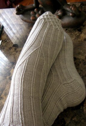 These socks are constructed from the toe-up. The toe features lattice work and ends with thin columns of ribbing. The gusset is placed in the center and the sides curve over into the heel. The entire sock uses Bavarian-style twisted stitches, which creates the high-relief appearance.