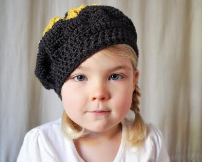 I love how this little tam turned out! The striking sunflower motif across the top of the tam adds a variety of textures. The fit is so adorable and the whole hat is a very unique piece.