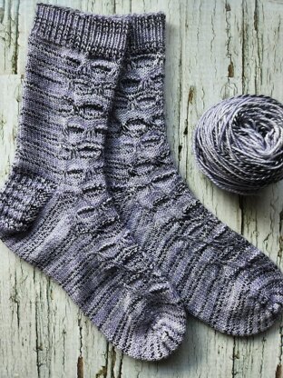 I love working with Deborah’s Sock Marl base! The strong horizontal stripes that come from the black strand in the yarn is very fun to manipulate & work with. The slip stitch design distorts the fabric to create the motifs and is only on the front of the sock. There is a purl stitch panel on the back of the sock to give a little bit of extra stretch.