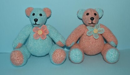The Button Twin Teddy Bears are knitted flat on two needles and then the pieces are sewn together. Both teddies are knitted using the same pattern.