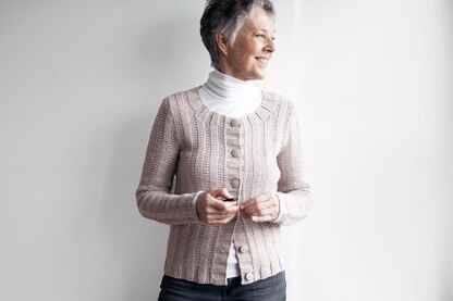 SKILLS REQUIREDLong-tail CO, circular knitting, decreasing (ssk, k2tog, p2tog), increasing (m1L, m1R, yo), 3-needle BO, short row shaping, setting in sleeve caps, stitch pick-up for neckline trim and button laps, and blocking.