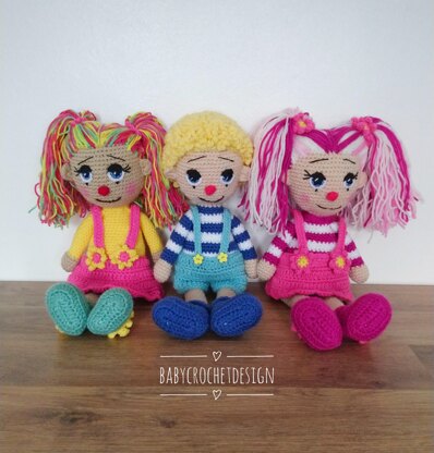 These super cute clown kids are crocheted all in one piece, the legs and arms are crochet on then continue to the neck then head. The only pieces to sew on are the hair and trimmings.