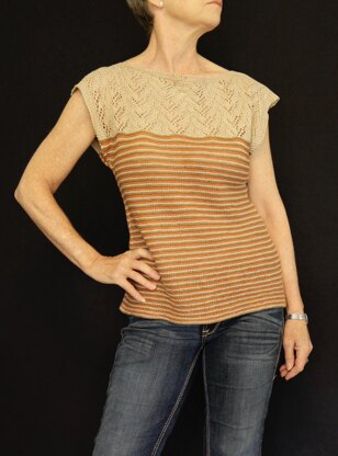 The top is worked in garter stitch from the bottom up and in the round to the armholes. The body is shaped so that it is wider over the hips, decreasing slightly to the waist. The front and back are then separated and worked separately back and forward to the shoulders. After shaping, the shoulders are joined using the three needle bind off.