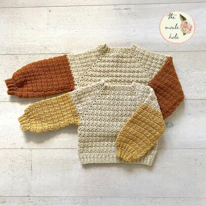 This pattern is so great for a boy or a girl. It work up super fast due to the stitch pattern and the Aran yarn. It is the perfect cozy autumn sweater for playing in the leaves.