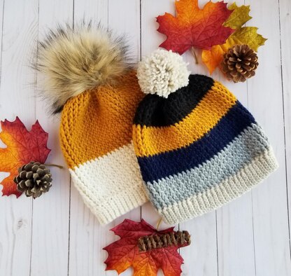 The pattern can be made in a solid color, two tone or multiple stripes and has a second joining option to make it seamless and reversible. It is worked from the bottom up and in the round to allow for horizontal color changes. The color combinations are endless for a truly unique beanie.
