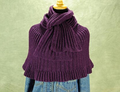 The capelet is worked in the round, from the bottom up, with no seaming required. It utilizes a stretchy, rib-based stitch pattern, that allows the garment to mold to multiple body sizes in just one simple version. It is as comfortable and easy to wear as any shawl, and makes an invaluable accessory piece suitable for year round wear. It’s a simple knit, yet it creates a seemingly complex textured fabric. The stitch pattern is written and charted for ease of use. The scarf pattern coordinates with the capelet and adds an elegant finish around your neck.