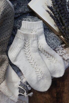 "A stunning lace panel cascades effortlessly down the side, and an overall classic structure and cozy stitches make The Gardenia Socks a truly stunning sock design to knit!"