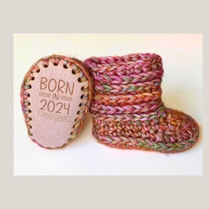 The pattern is designed to be made with or without a faux suede sole. The pattern is for sizes 0-3 months and 3 - 6 months with sole, and newborn, 0-3 months, 3-6 months, 6-12 months with a crochet sole. It also comes with 3 alternative cuff styles.
