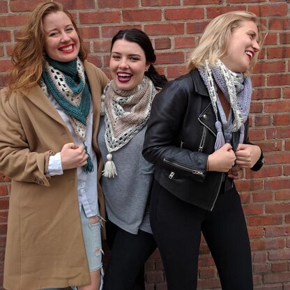 This pattern is for a cozy, pretty, and tasseled (!) triangle scarf. Named for my great great aunt Gemma! It features three color blocks, with an interrupting ‘lace line’. A little extra coverage for the cold, and an awesome addition to any outfit.