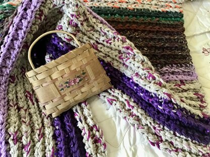 The unique design in The Gypsy Textured Throw uses stash yarn throughout. 3 balls of this, 5 skeins of that etc. it is a combo of worsted yarn and chunky yarn from Red Heart super saver, Schachenmayr Lova, Noro air and many more. It is textured and completely reversible.