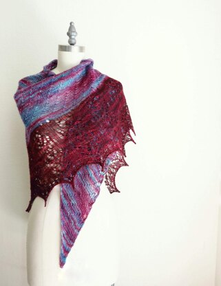 Two-color shawl knitted sideways withs simple texture stitches for main color section and lace stitches for contrast color border.