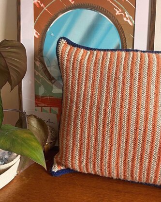 This cushion cover is knit up using chunky weight yarn, features a herringbone stitch front and back, and is seamed together with I-cord piping.