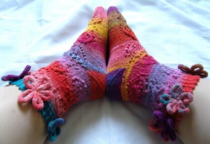 The Hippie Hippie Socks give you a daisy-chain coronet and a paisley frock, and, in keeping with the free-and-easy attitude of the 60's, you have a choice of four different paisley patterns for the main part of the sock! You can use them all in any combination, or choose your favourite and just work that one for the whole sock! But no matter how you make it up, this sock is absolutely perfect for those brighter shades of Noro or slow-colour-changing yarn!