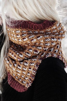 Description: "Gorgeous, mesmerizing texture dancing around harmoniously with three different colors plus a stunning split-hem feature, makes The Horizon Cowl a truly stunning accessory. Although the project looks complicated, this cowl is knitted with only the simplest of knit stitches and techniques (no fair-isle knitting required!) and works up super quickly. The knitting pattern equips you with highly-detailed written instructions, a stitch glossary, a schematic with precise measurements, links to numerous video and photos and more. If you're looking for a one-of-a-kind, textured, and super cozy cowl scarf, then look no further than The Horizon Cowl knitting pattern!"