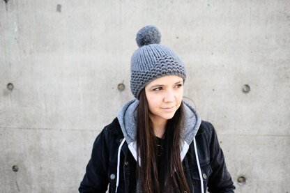 A fun, chunky knit bobble hat with a garter stitch brim and geometric isosceles triangle pattern in garter stitch on a stocking stitch ground. The perfect fun, one ball, quick knit project!