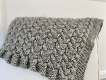 This blanket is warm, cozy and available in stroller size, baby blanket size and for an afghan.= 20x 24", 26x30", 50x60" Knit with a chunky weight yarn and US #10 needle.