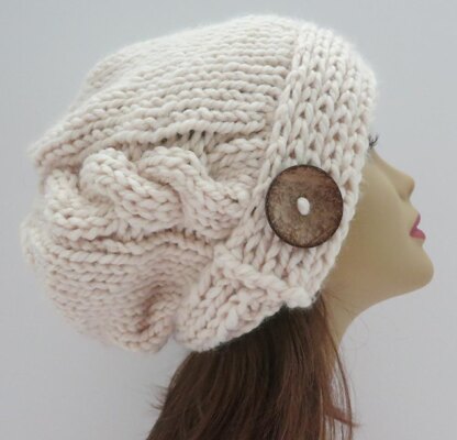 The Jenna slouch hat is a snuggly warm hat. Design features include vertical and horizontal stitches, a single cable, and a faux button tab. This is a perfect fashion accessory for cold, wintry weather. Super bulky yarn and large needles make this a quick and easy knit.