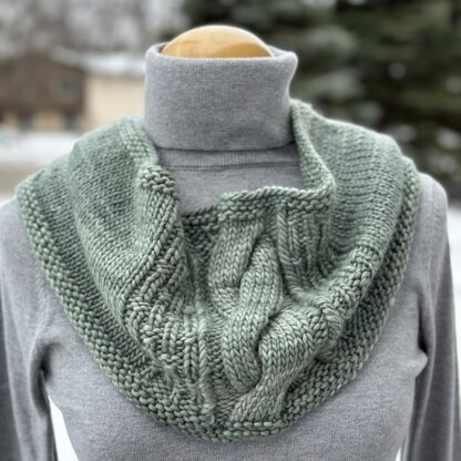 The Kelvin Cowl has a single, wide cable on the front of it, framed by a twisted stitch on either side, and a bit of texture for fun and to keep your interest while knitting it!