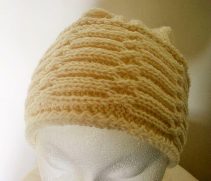 One size unisex knitted hat with a slight slouch. Brim is knitted first, then the crown picked up. Brim can be knitted as an earwarmer/headband by omitting the crown. 100gms of yarn 1 pair of 5mm needles wool/tapestry needle for sewing up seam.
