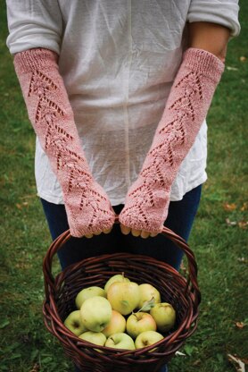 The Landlady's Fingerless Gloves are lace weight elbow-length fingerless gloves knit from the cuff to the hand. The outside of the gloves features an Estonian lace blossom motif, the inside of the forearm features subtle cabling that acts as shaping to taper the glove to the wrist. The thumb is formed by working the stitches flat to create an opening, then rejoining in the round to finish.