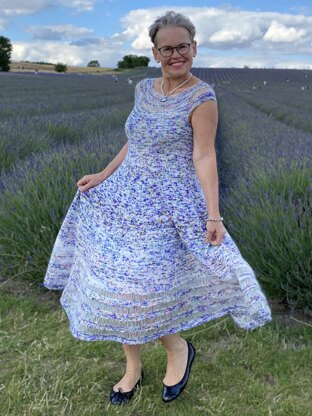 Feel comfort while looking elegant and classy in this Lavender Field Dress knitted using speckled sock yarn. Featuring very simple flared design, relaxed fit, drop stitch yoke and hem (drop stitch is drop dead gorgeous), round neckline edge, short sleeves, this dress is the perfect balance of sexy and classy. The flare towards from the yoke to the hem of the dress and ensures you will look graceful as you move! And most important- half circle skirt is sure to flatter all figures!